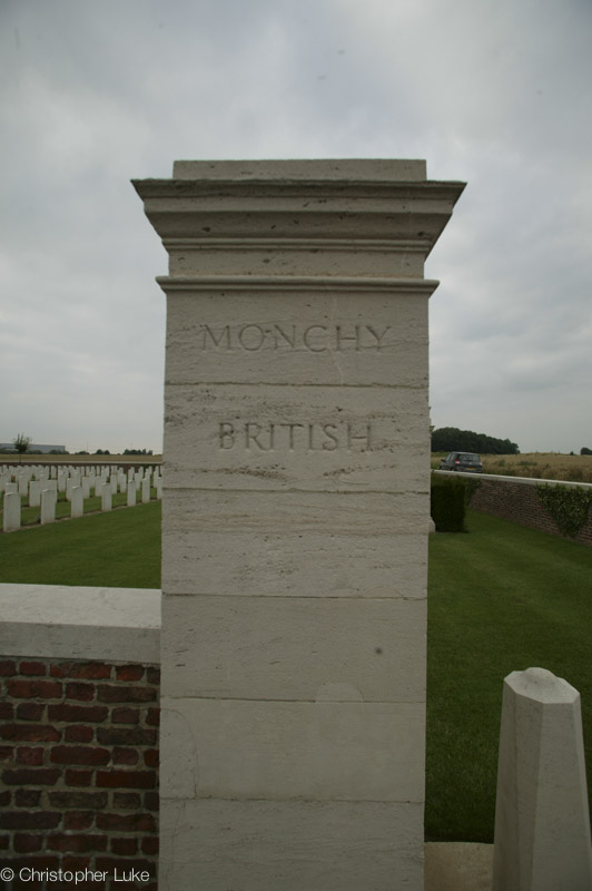 Monchy village, a relatively high and commanding position, was captured by Commonwealth forces on 11 April 1917. The cemetery was begun at once and continued in use as a front-line cemetery until the German offensive of March 1918, when it fell into their hands. It was recaptured by the Canadian Corps on 26 August and used again for a month. The graves are very closely identified with the divisions which fought on this front. There are now 581 Commonwealth servicemen of the First World War buried or commemorated in this cemetery. 58 of the burials are unidentified but there are special memorials to a number of casualties known to be buried among them. The cemetery was designed by Sir Edwin Lutyens. Source - CWGC.org
