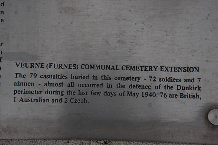 VEURNE COMMUNAL CEMETERY contains two Commonwealth burials of the First World War. The adjoining COMMUNAL CEMETERY EXTENSION contains 77 Commonwealth burials of the Second World War, almost all of which date from the last two or three days of May 1940 when the British Expeditionary Force withdrew to a small area around Dunkirk. There are also two Czech war graves within the extension. Source - CWGC.org